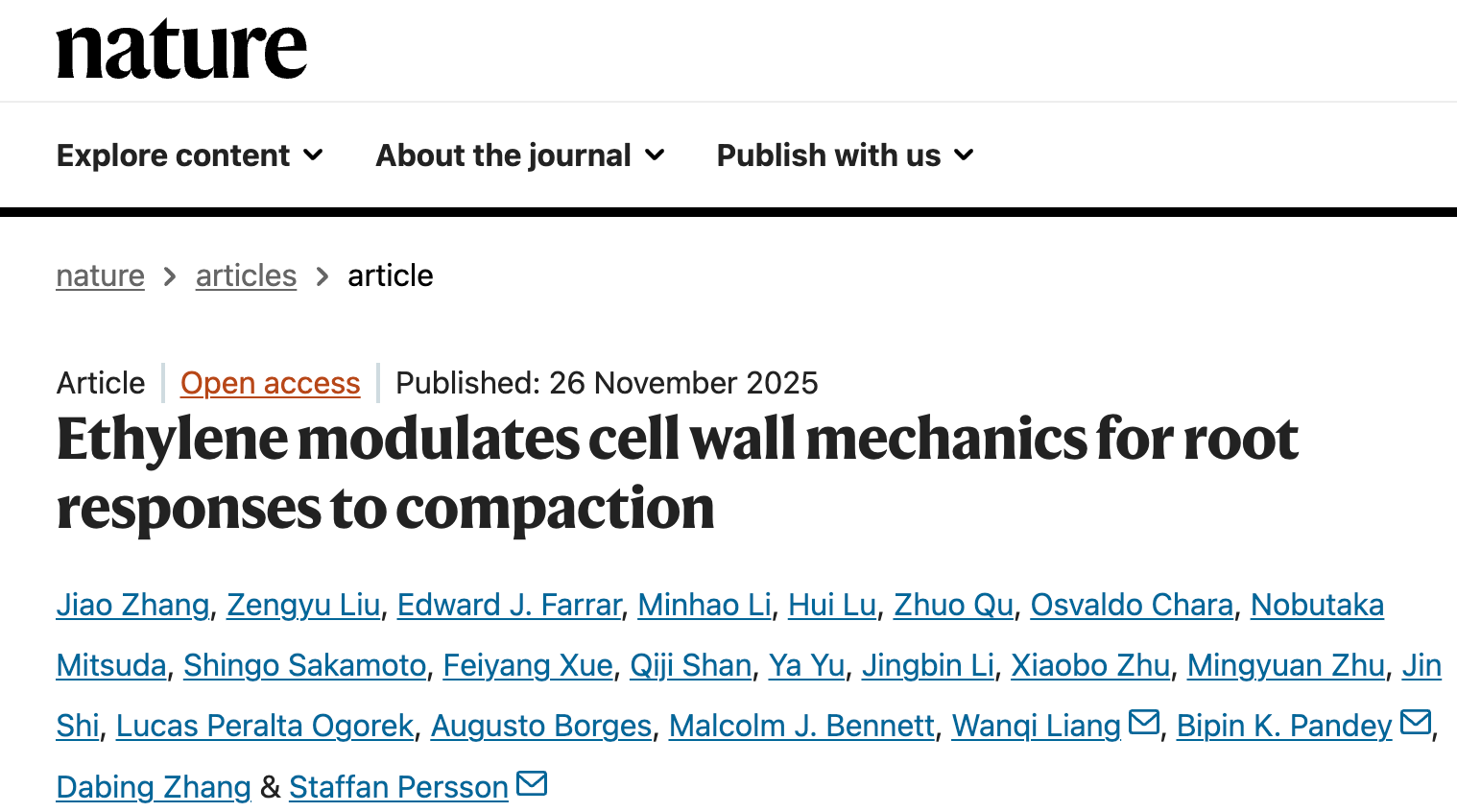 近日,Av解说 张大兵和梁婉琪教授团队联合丹麦哥本哈根大学Staffan Persson教授团队、英国诺丁汉大学Malcolm J. Bennett教授团队在国际学术期刊《自然》(Nature)上发表题为:“Ethylene modulates cell wall mechanics for root responses to compaction”的最新研究,首次揭示了植物根系利用工程学原理适应板结土壤:通过主动响应积累的乙烯,精细调控细胞壁厚度,从而促进根系增粗,提高穿透能力以适应土壤板结。