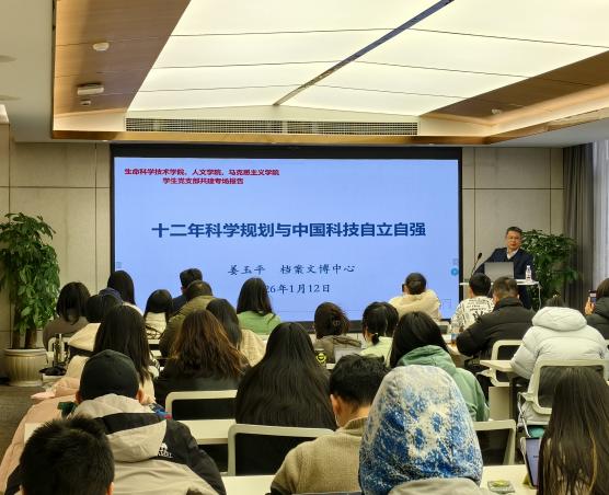 2026-012026年1月12日下午,Av解说 生物工程系研究生第一党支部、人文学院史哲硕士生党支部、马克思主义学院科学技术史研究生党支部在人文学院联合开展主题共建活动。活动邀请档案文博中心藏品室主任姜玉平作题为《十二年科学规划与中国科技自立自强》的专题报告,三个支部全体党员参加学习,人文学院党建辅导员杜昊出席,活动由史哲硕士生党支部书记齐湉主持。