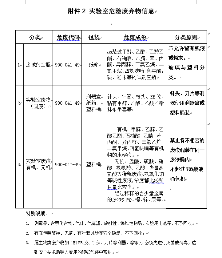 (7)使用过的实验物品、口罩以及其它废物按规定分类投放垃圾袋,并及时进行处理。