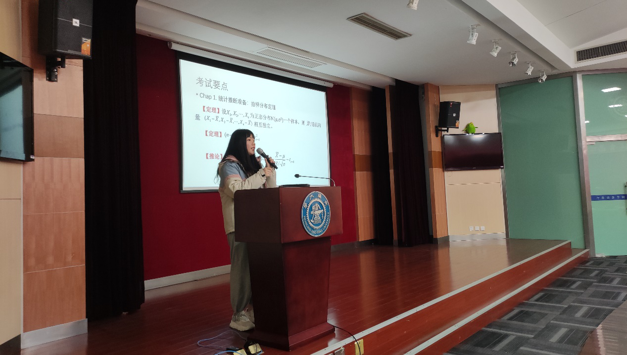 交流会上,王一茗向大家介绍了基础数理统计中不同章节的重点概念和重要公式,并和同学们分享了一些重要的注意事项,如时间的把握、统计量是否相互独立等。