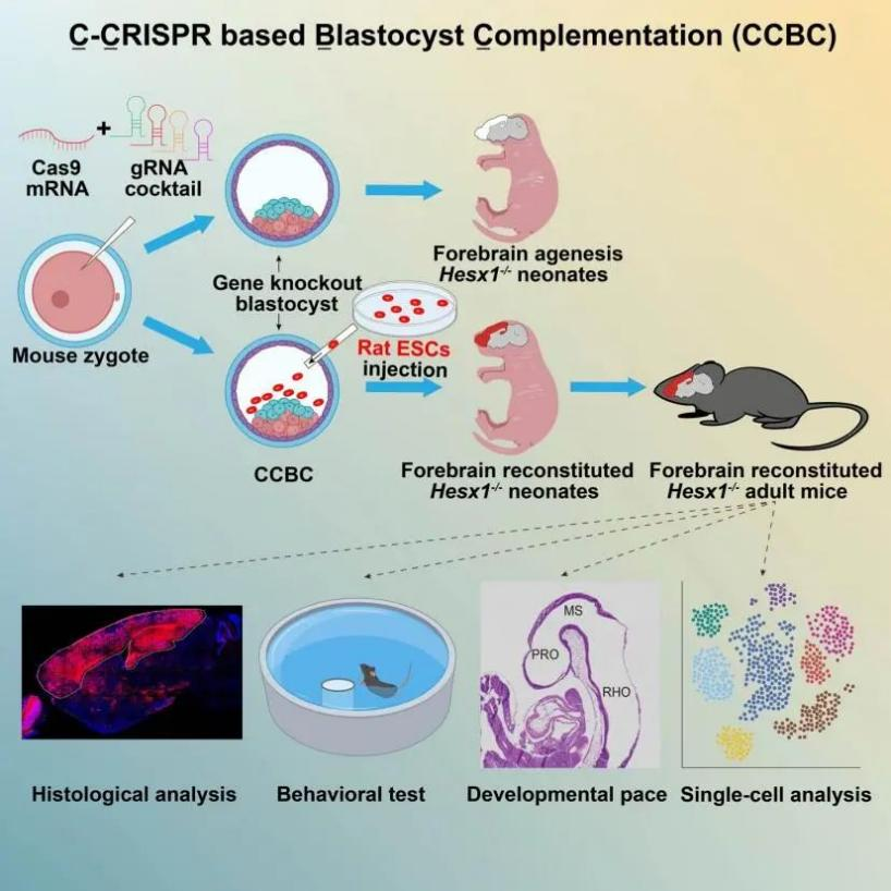 异种嵌合体是由不同物种细胞所形成的生物个体,是理解基因功能和细胞发育机制的重要工具。通过一种称为异种囊胚互补的技术(Interspecies blastocyst complementation, IBC)研究者能够在动物体内培育其他物种的器官。这项技术涉及将供体多能干细胞注入缺失关键发育基因的宿主囊胚中,让供体细胞补偿宿主缺失的器官或组织,从而在一个物种里生成来源于另外一个物种的器官。之前的研究在小鼠中生成了大鼠的胰腺、胸腺、血管内皮组织和生殖细胞,以及在大鼠中生成了小鼠的胰腺、肾脏和生殖细胞。然而,到目前为止,还没有实现任何大脑组织的异种囊胚互补。在一个物种体内生成另一个物种的大脑组织不仅可以使研究者在进化背景下进行大脑发育和功能的研究,还能为人类多能干细胞对动物大脑的贡献所引起的伦理问题提供参考。