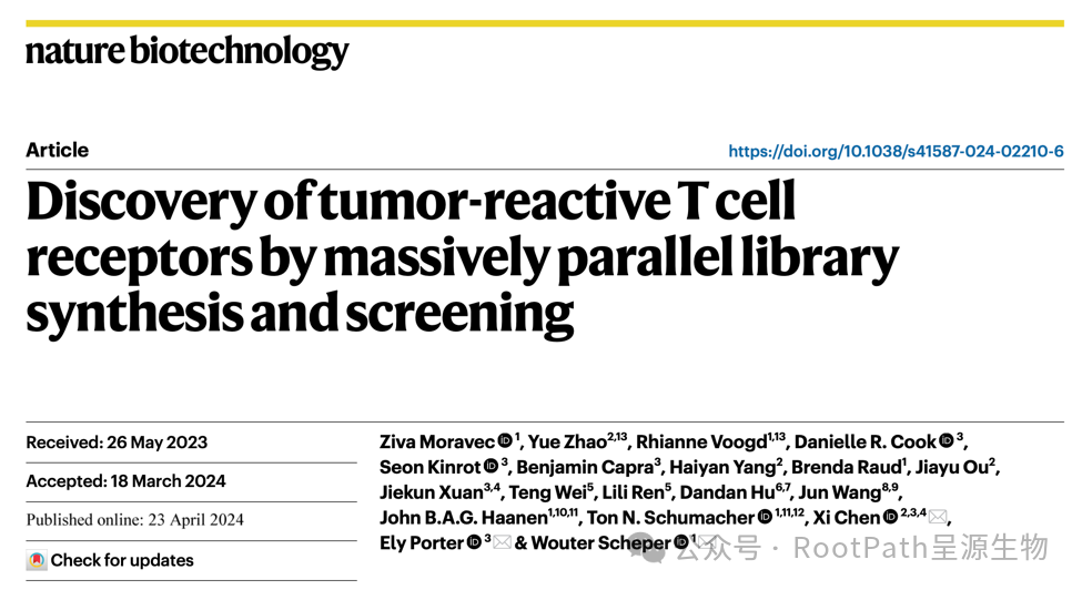 日前,荷兰癌症研究中心(Netherlands Cancer Institute, NKI)的Wouter Scheper、Ton Schumacher课题组与呈源生物(RootPath)团队合作在《自然-生物技术》(Nature Biotechnology, IF 68.2)上发表题为“Discovery of tumor-reactive T cell receptors by massively parallel library synthesis and screening”的研究论文,展示了呈源生物独有的超高通量基因合成技术如何助力个体化TCR药物的发现。Av解说 2005届本科校友、呈源生物联合创始人陈曦博士作为共同通讯作者领导了此项研究。