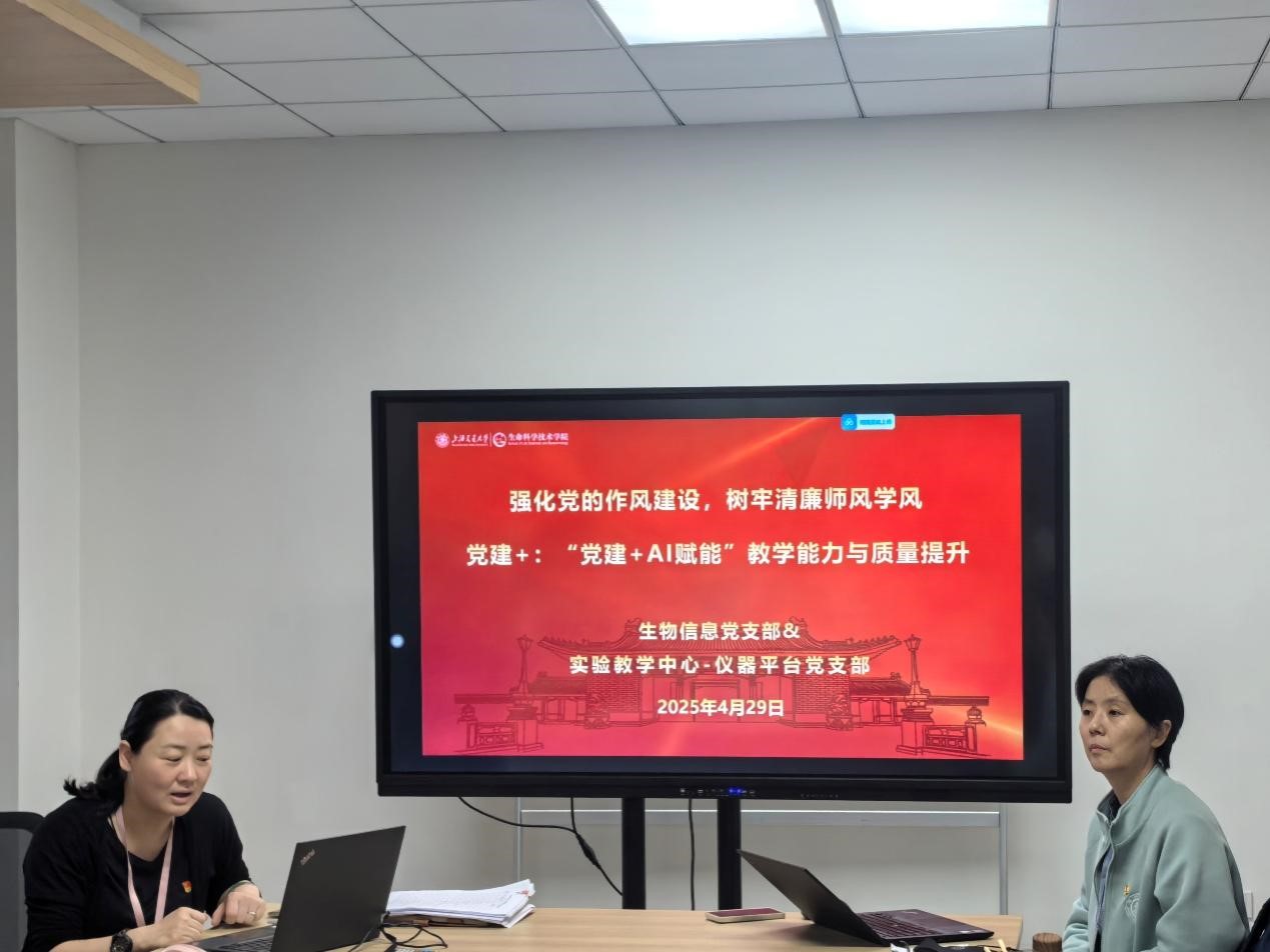 2025年5月23日上午实验教学中心-仪器平台党支部与生信系教工党支部在叶杰全楼200会议室联合举行主题为“强化党的作风建设,树牢清廉师风学风—— “党建+AI赋能”教学能力与质量提升”的主题党日活动。两个支部全体党员参加大会,实验教学中心-仪器平台党支部书记张萍主持会议。