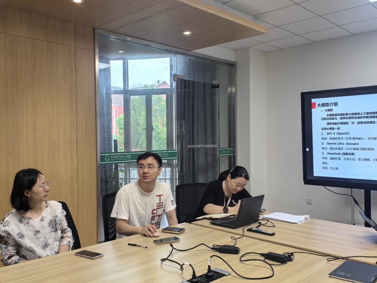 随后,围绕本次“党建+”主题,邀请生信系教工党支部党员邵文广老师做“大模型在科研与教学中的应用”的报告。他介绍了什么是大模型、及哪些大模型软件可以在科研和教学中为大家提供帮助。