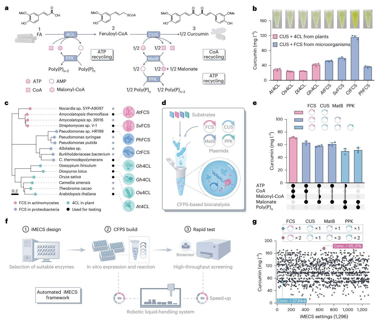 研究团队系统评估了iMECS平台在不同天然产物合成路径中的通用性与适应性,成功实现了包括姜黄素、香兰素和覆盆子酮在内的多种香料等添加剂类天然产物的高效合成。在不添加外源辅因子的条件下,各目标产物的转化率均超过90%。此外,该平台具备高度模块化特性,能够通过酶种更换与途径扩展,灵活应对多类苯丙素化合物的合成需求。进一步结合木质素的化学解聚技术,iMECS系统可直接将富含木质素的农业废弃物高效转化为高值产物,其整体催化效率较现有体系提升高达48倍。