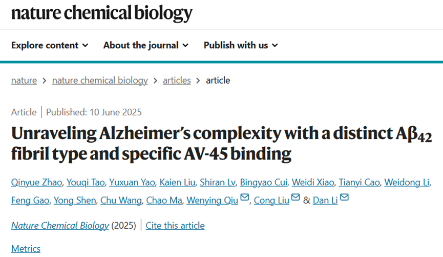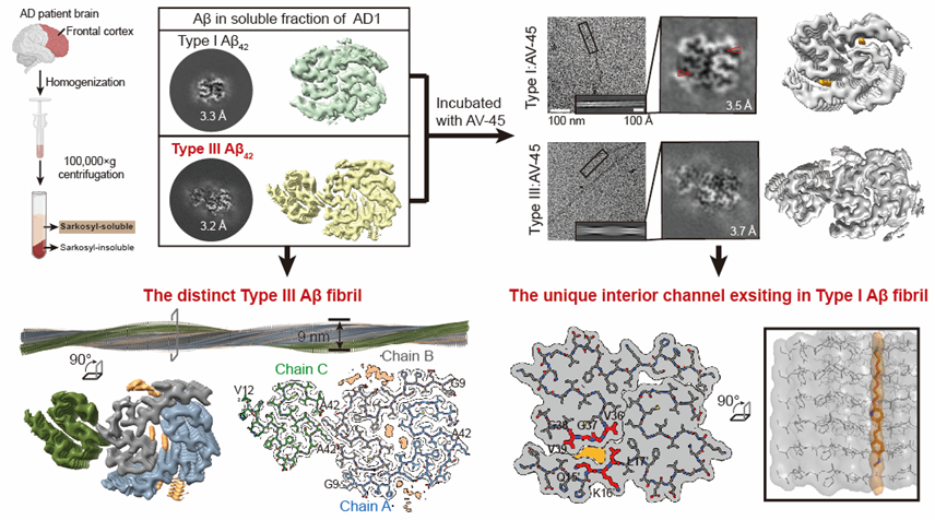 2025年6月11日,Av解说 Bio-X研究院李丹团队、中国科学院上海有机化学研究所生物与化学交叉中心刘聪团队,联合中国医学科学院基础医学研究所仇文颖团队,在Nature Chemical Biology期刊上发表了题为“Unraveling Alzheimer's Complexity with a distinct Aβ42 Fibril Type and Specific AV-45 Binding”的研究论文。该工作在AD患者脑组织“可溶组分”中发现全新的Aβ42病理纤维聚集体类型(Type III),并首次阐明临床PET示踪剂AV-45识别Aβ42的分子机制,为AD的精准分子分型与新一代PET示踪剂的研发提供了理论依据与新思路。