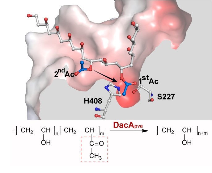 塑料污染已成为全球性环境挑战,而自然界中的微生物蕴藏着降解塑料的潜在“钥匙”。聚乙烯醇(PVA)及其乙酰化衍生物作为一种石油基的生物可降解塑料,在工业中广泛应用。前期,周宁一团队分离了一株利用聚乙烯醇的菌株Comamonas sp. NyZ500并从中筛选与鉴定出一种独特的PVA脱乙酰酶DacApva(Appl. Environ. Microbiol. 2021, 87 (8), e03016-20)。该酶能高效催化乙酰化PVA的脱乙酰反应,并具有广谱的O-乙酰化底物去修饰功能。然而,该酶如何识别并结合稳定碳-碳(C-C)链为主骨架聚合物的分子机制尚未知晓。