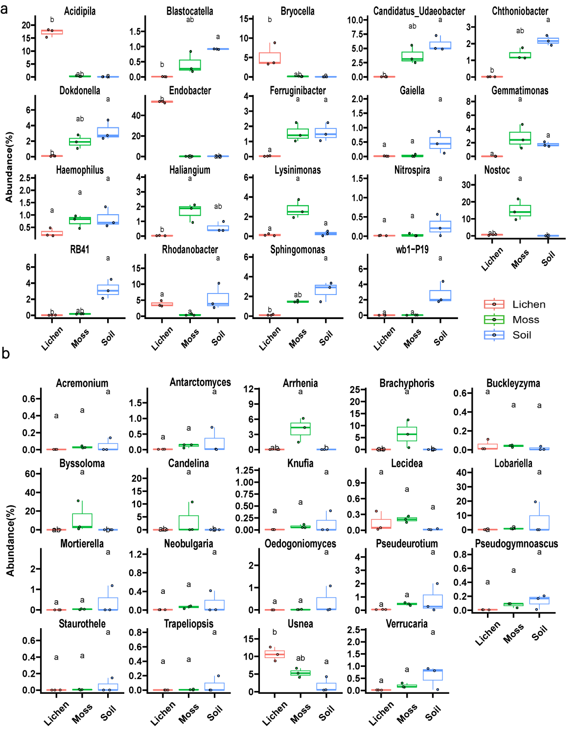 图1. 苔藓、地衣和土壤微生物组中丰度最高的 20 个原核生物和真菌属统计分析
