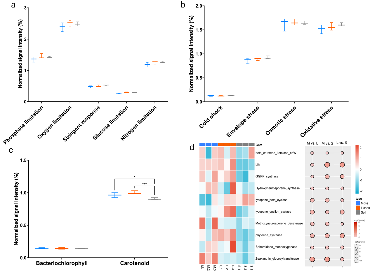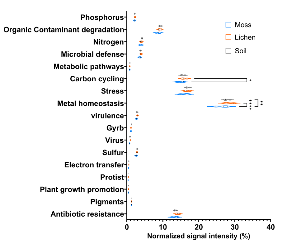 图2. 苔藓、地衣和土壤微生物基因的相对丰度差异