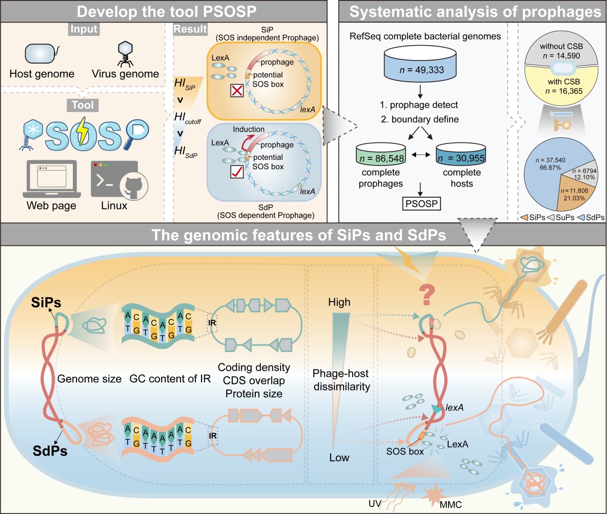 在《iMeta》期刊发表的研究中,团队开发了一个新型生物信息学工具——原噬菌体SOS依赖性预测工具(Prophage SOS-dependency Predictor, PSOSP),该工具通过分析SOS途径的关键调控因子LexA蛋白与靶DNA结合的异源性指数(Heterology Index, HI)来预测原噬菌体的诱导模式,并将其分为SOS依赖型原噬菌体(SdPs)与SOS非依赖型原噬菌体(SiPs)。在研究中,团队以自主分离的两株深海细菌Shewanella piezotolerans WP3和S. psychrophila WP2及它们所包含的4个原噬菌体为对象,通过一系列分子生物学和噬菌体诱导实验验证了PSOSP的可靠性。结果表明:PSOSP能够准确地区分SdPs和SiPs,灵敏度与特异性均达到100%。进一步将PSOSP应用于49,333个完整细菌基因组,成功推断出15,493个细菌基因组中的原噬菌体诱导模式,并鉴定出11,806个SiPs。这些SiPs广泛分布于145个细菌属中,且与SdPs相比表现出独特的基因组特征。相应地,这两种类型原噬菌体的宿主之间也被推测存在生理特征的不同(图1)。PSOSP工具的开发及应用不仅揭示了原噬菌体诱导机制的多样性,还为未来深入开展噬菌体与宿主互作研究提供了重要的方法学支持。