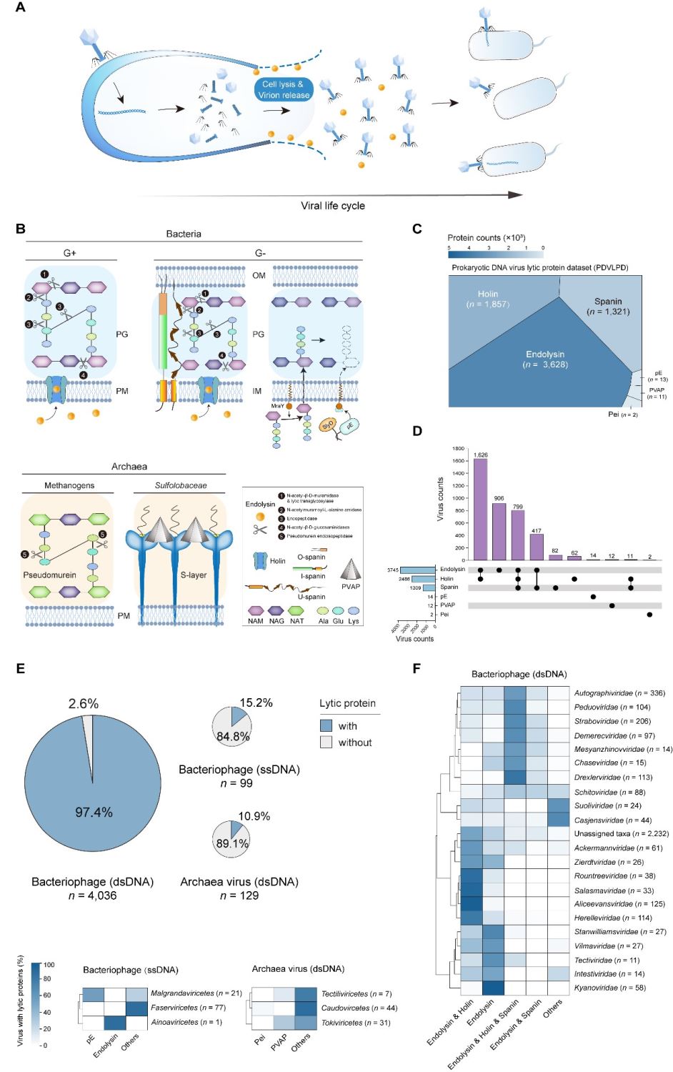病毒是地球上数量最庞大的生命实体,其中绝大多数是以细菌和古菌为宿主的原核病毒。病毒介导的细胞裂解是微生物死亡的主要方式之一,每日可裂解约20%的海洋微生物,每年释放0.37-0.63 Gt碳,深刻影响着全球生物地球化学循环。这一过程曾被认为是的溶菌酶的单一作用,但近年研究发现,病毒裂解宿主是一个高度复杂且精确调控的生物学过程,依赖于多种裂解蛋白(lytic proteins, LyPs)的协同作用。尽管对病毒裂解机制的研究已取得重要进展,但在宏观进化尺度上对原核病毒裂解蛋白的系统性认知仍然十分有限。在《The ISME Journal》期刊上发表的研究中,团队构建了国际首个“原核DNA病毒裂解蛋白数据集”(PDVLPD),整合了包括裂解酶 (Endolysin)、穿孔素 (Holin)、融合素 (Spanin) 等六大类裂解蛋白,涵盖4264个高质量病毒基因组 (图2)。