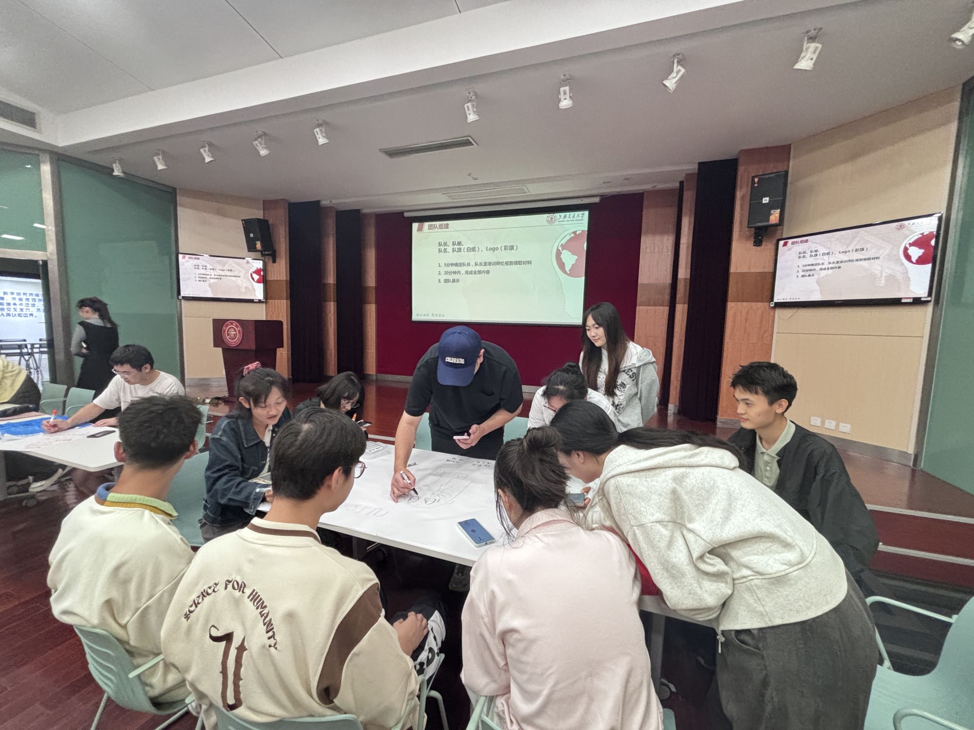 接着,同学们组成三组,在培训师的带领下进行团队建设,各小组在规定时间内确定队长、队秘、队旗、队歌等,并进行团队展示,促进了队员间的相互交流,并增强了各小组的默契度与凝聚力。