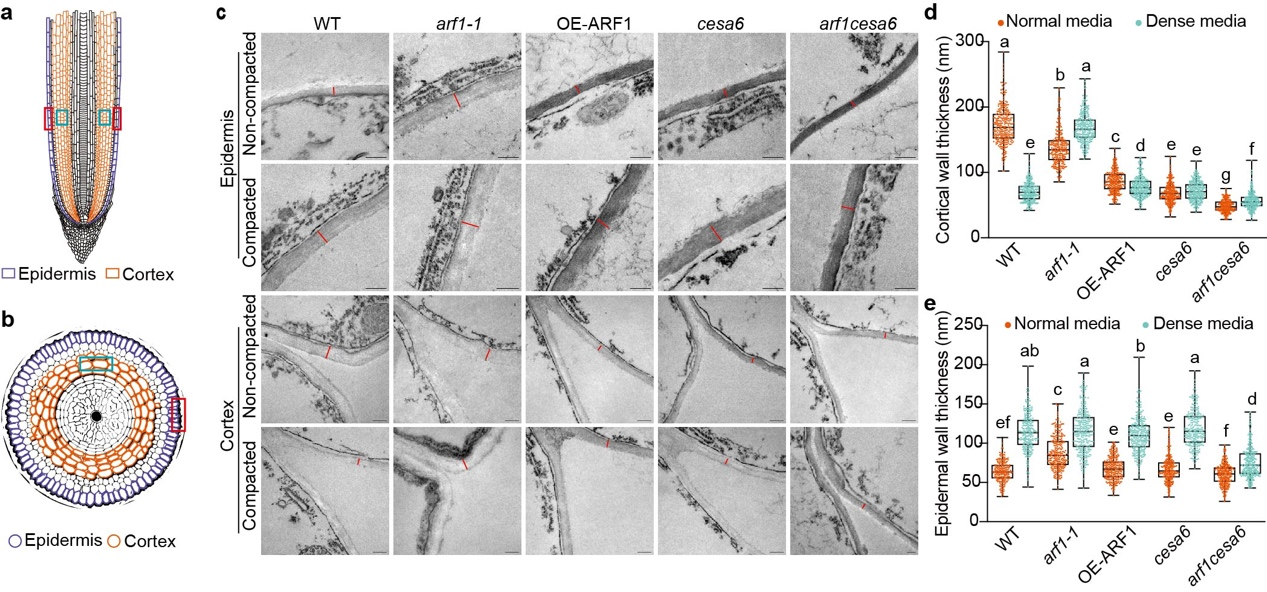 实验验证了这一机制的精确性:缺失OsARF1的突变体(arf1-1)皮层细胞壁始终"厚重",无法膨胀;而过量表达OsARF1(OE-ARF1)和纤维素合成酶突变体(cesa6)则形成"薄软"皮层,可自由膨胀穿透板结层。