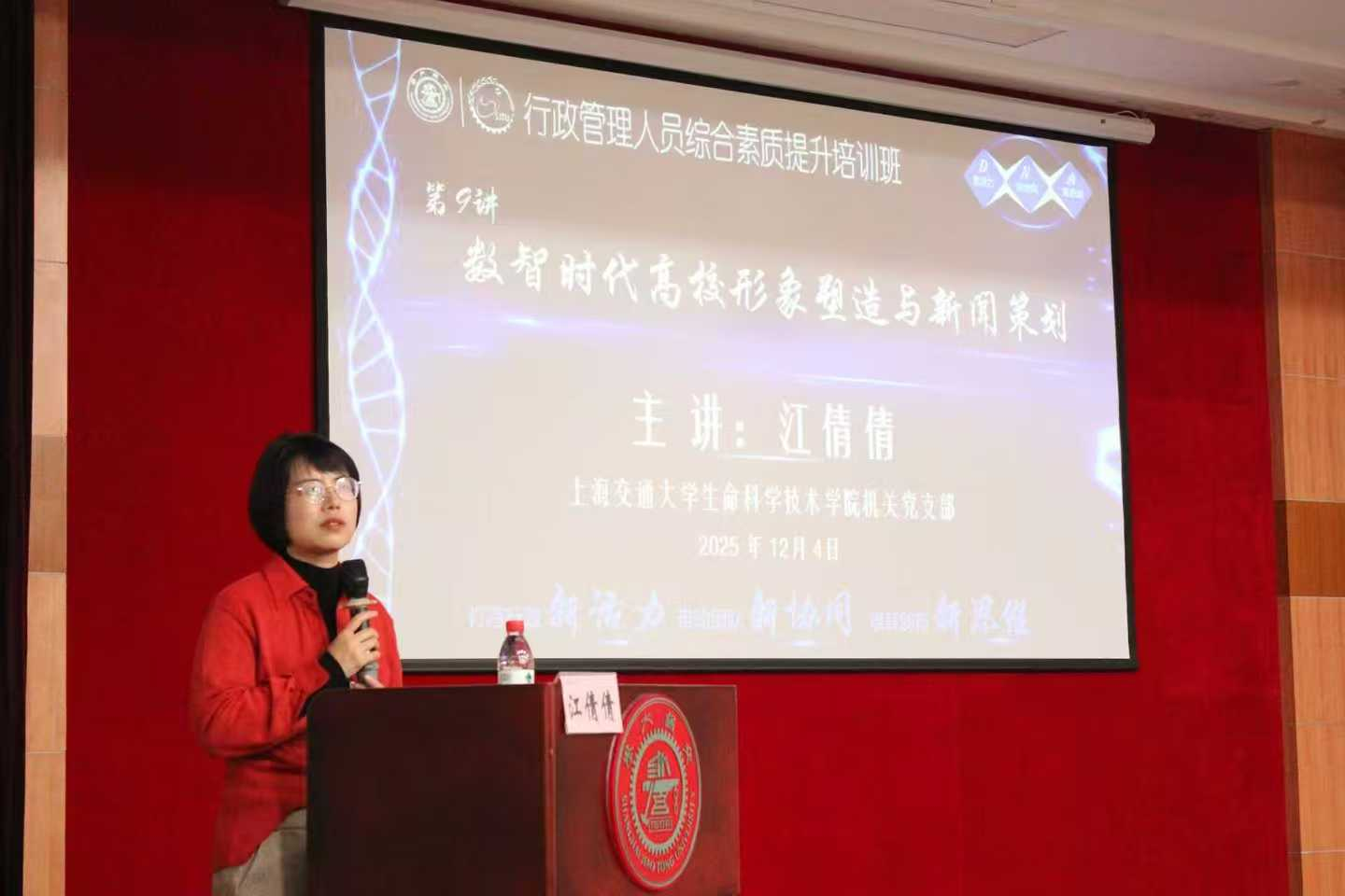 随后,江倩倩老师以《数智时代高校形象塑造与新闻策划》为题作专题培训。她结合自身丰富的实践经验,系统阐释了数智时代信息传播的新特点、新挑战与新机遇,围绕高校形象塑造的核心要素、新闻策划的创新方法以及传播影响力的提升路径等进行了深入讲解。报告紧扣时代脉搏,融入前沿热点与鲜活案例,内容丰富、讲述生动,兼具理论高度与实践价值,体现出鲜明的时代性与指导性,对提升行政宣传队伍的专业素养与实战能力具有重要意义。