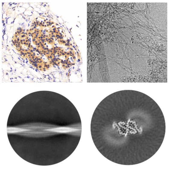 图1 病人胰腺中hIAPP纤维的提取及结构解析。左上:病人胰腺切片的hIAPP免疫组化分析;右上:胰腺提取物的冷冻电镜图片;下:纤维冷冻电镜数据的二维分类及三维重构。