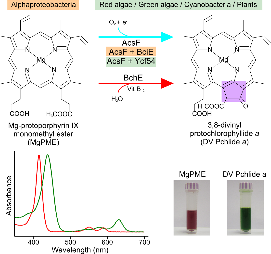 Chen GE, Adams NBP, Jackson PJ, Dickman MJ, Hunter CN. (2021) How the O2-dependent Mg-protoporphyrin monomethyl ester cyclase forms the fifth ring of chlorophylls. Nat Plants 7: 365-375