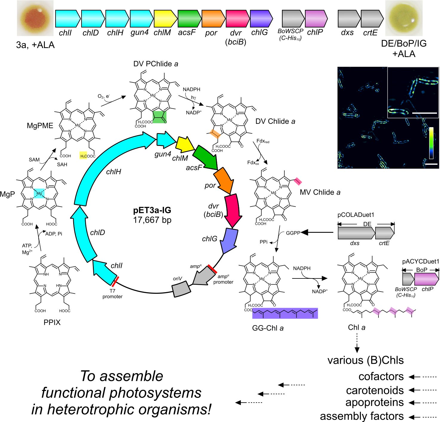 Chen GE, Hunter CN. (2023) Engineering chlorophyll, bacteriochlorophyll and carotenoid biosynthetic pathways in Escherichia coli. ACS Synth Biol 12: 2236
