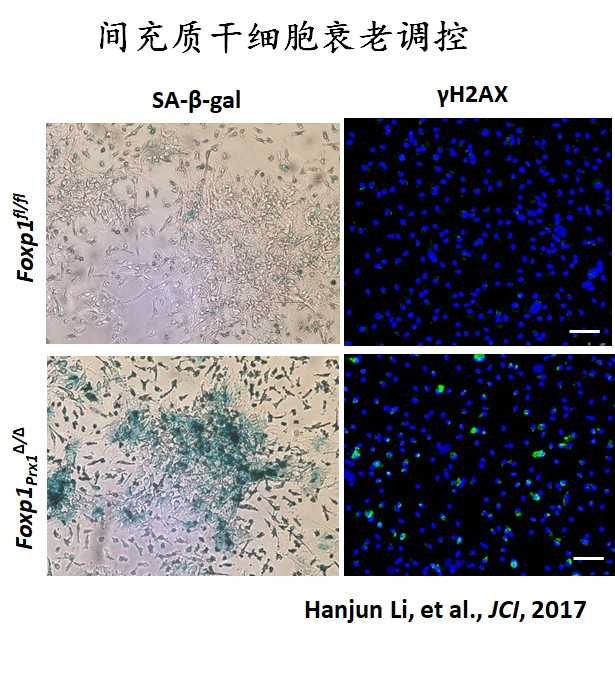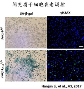 间充质干细胞的衰老是肌体许多衰老疾病的细胞学基础。清理衰老细胞(senolysis)可以作为治疗衰老相关疾病的重要策略。我们研究发现Foxp1基因调控骨髓间充质干细胞的衰老,这有可能作为调控衰老疾病的重要靶点之一。