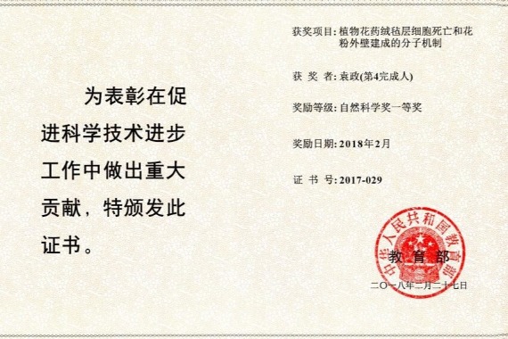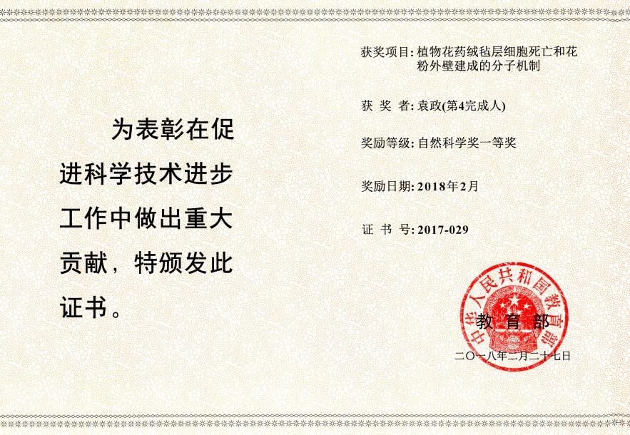 • 2017年 植物花药绒毡层细胞死亡和花粉外壁建成的分子机制,教育部自然科学奖,一等奖(4/4)